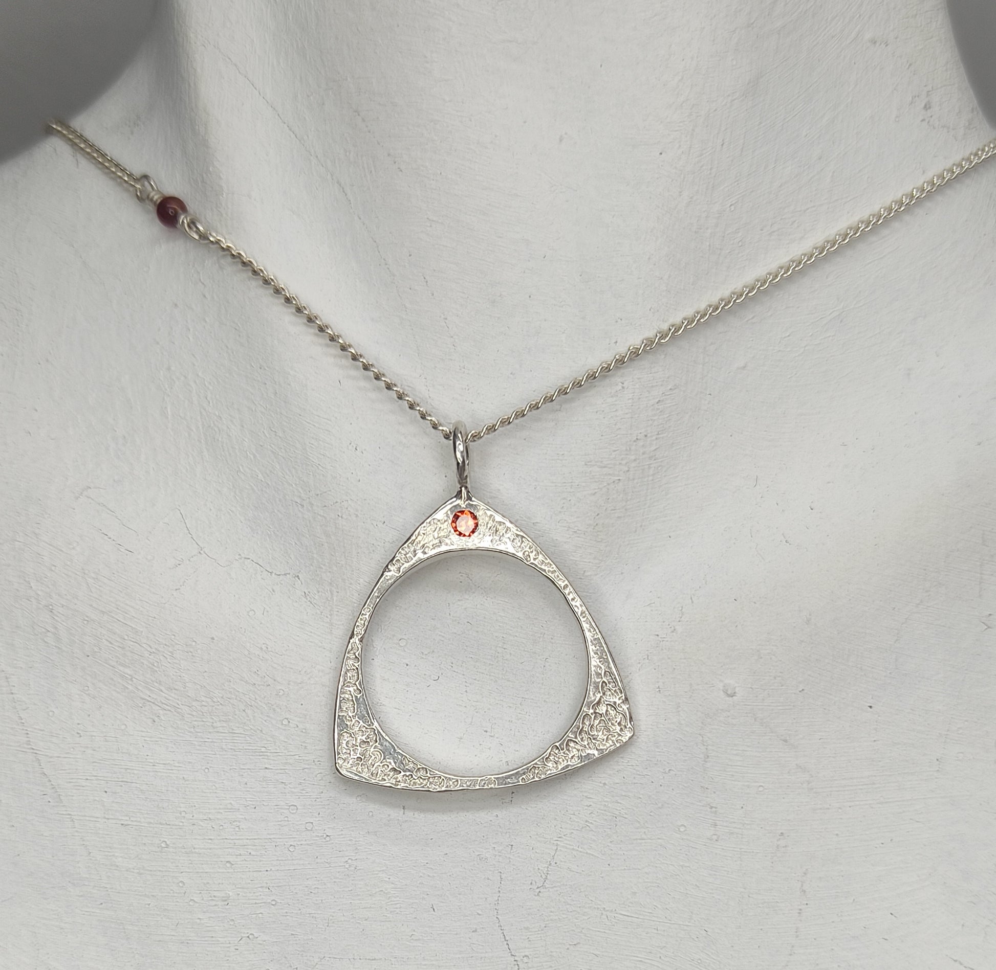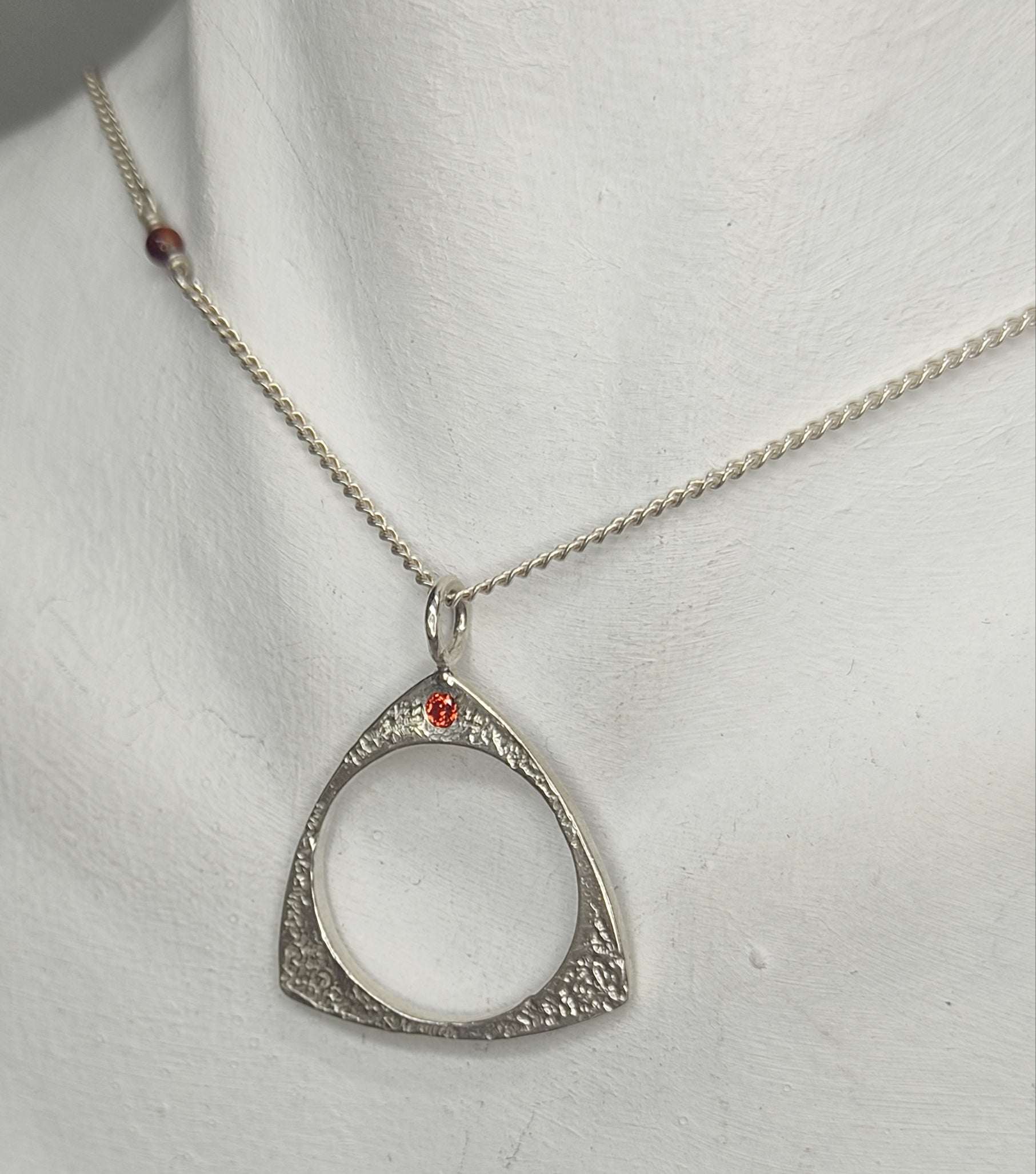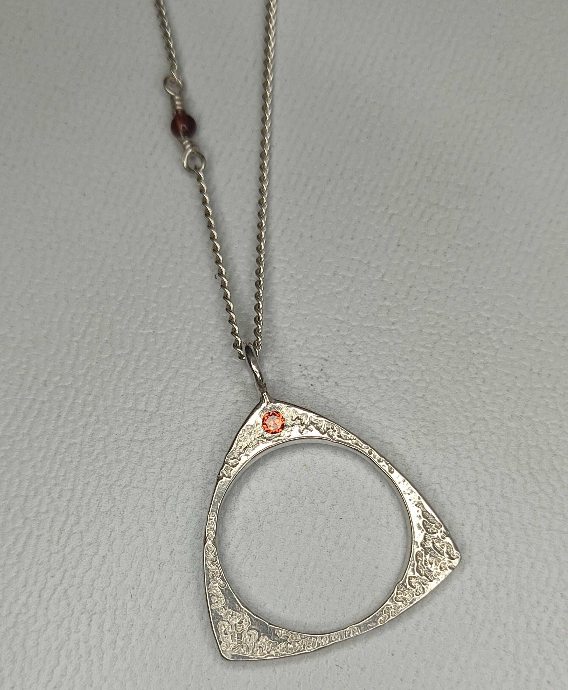 Elegante y sutil colgante tipo gargantilla "fuego místico" hecho a mano en plata 950 cadena y dije central mediano con engaste invisible zirconio naranja. Inspirado en la representación del fuego del antiguo filósofo Empédocles.