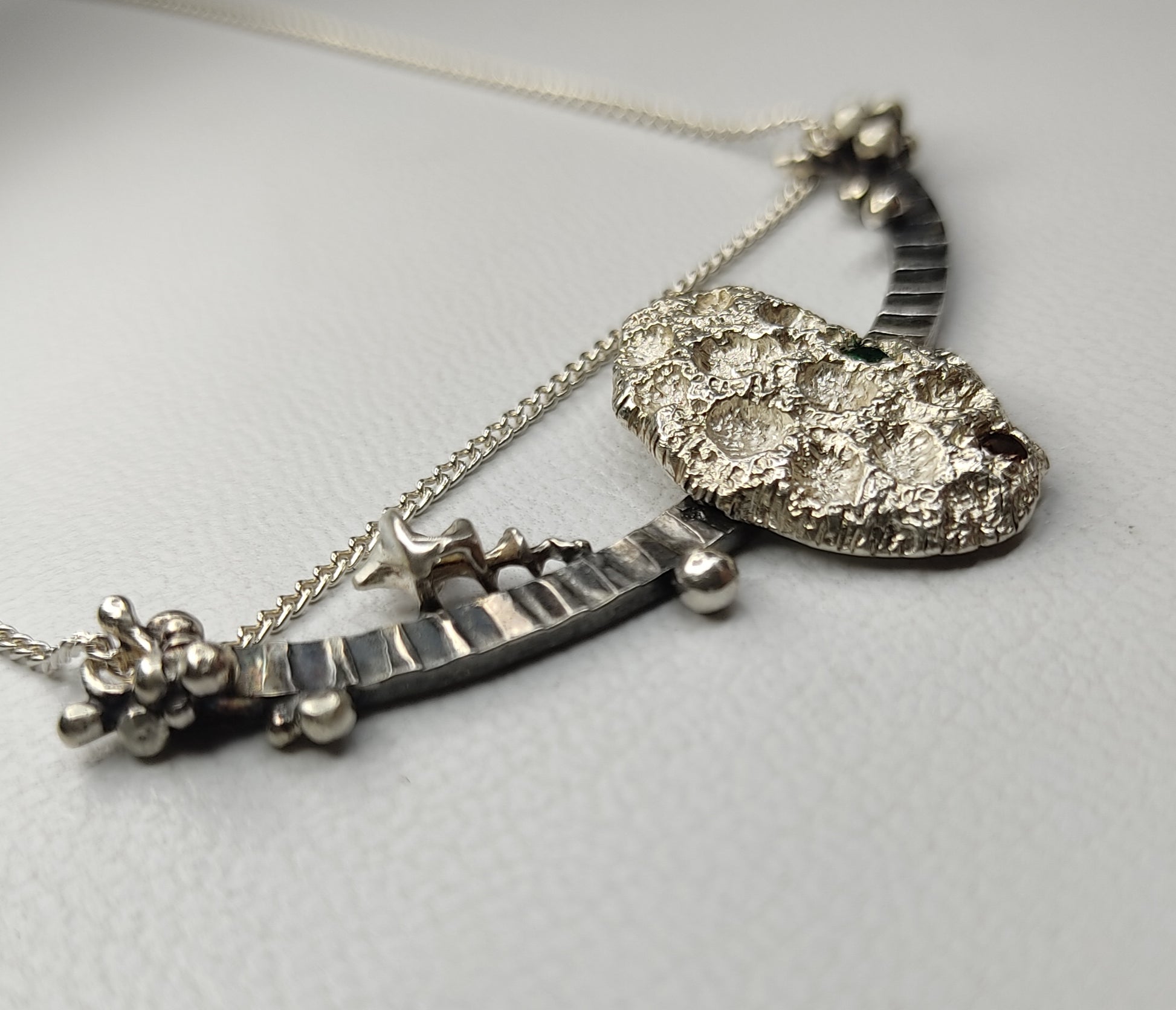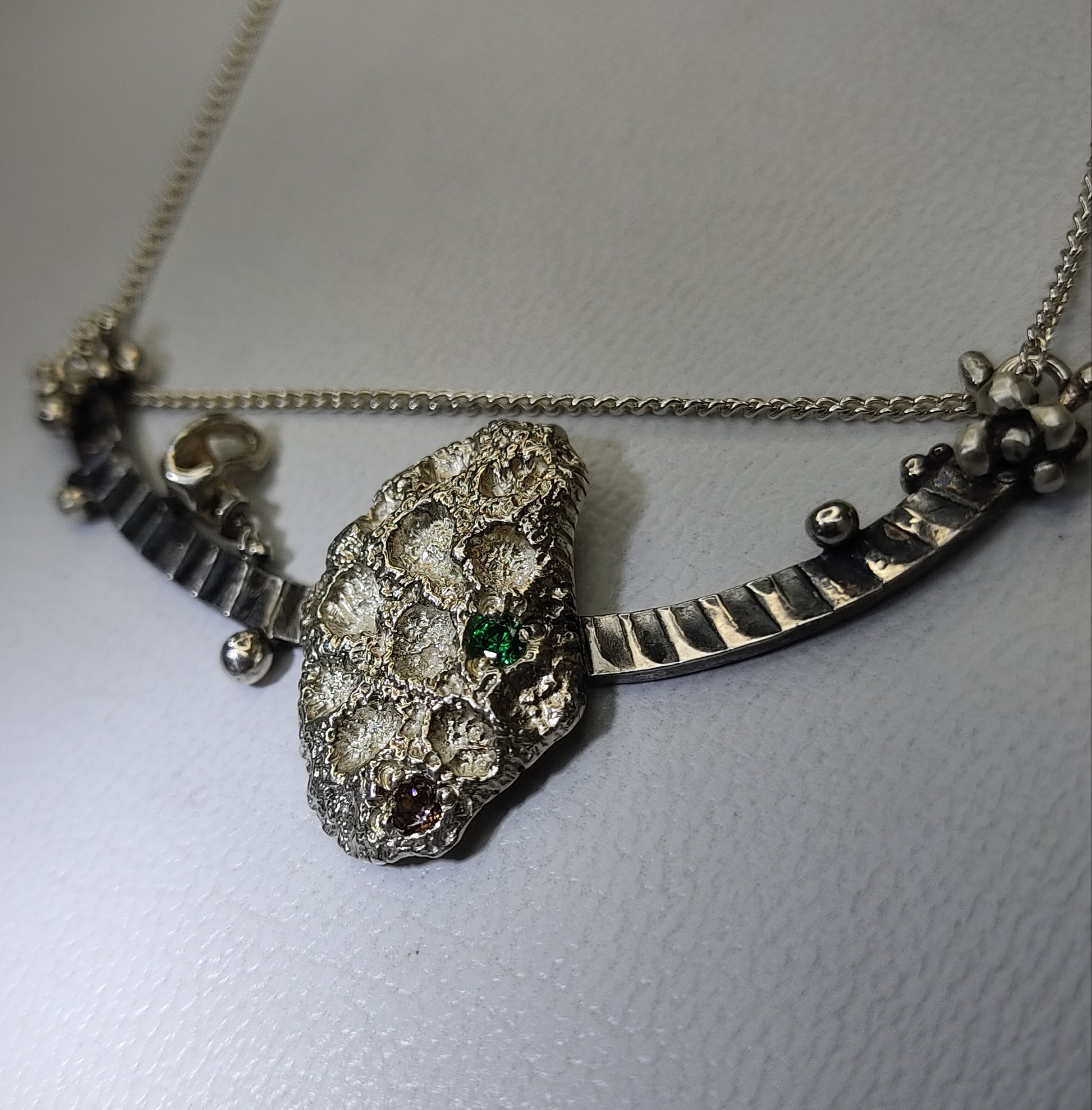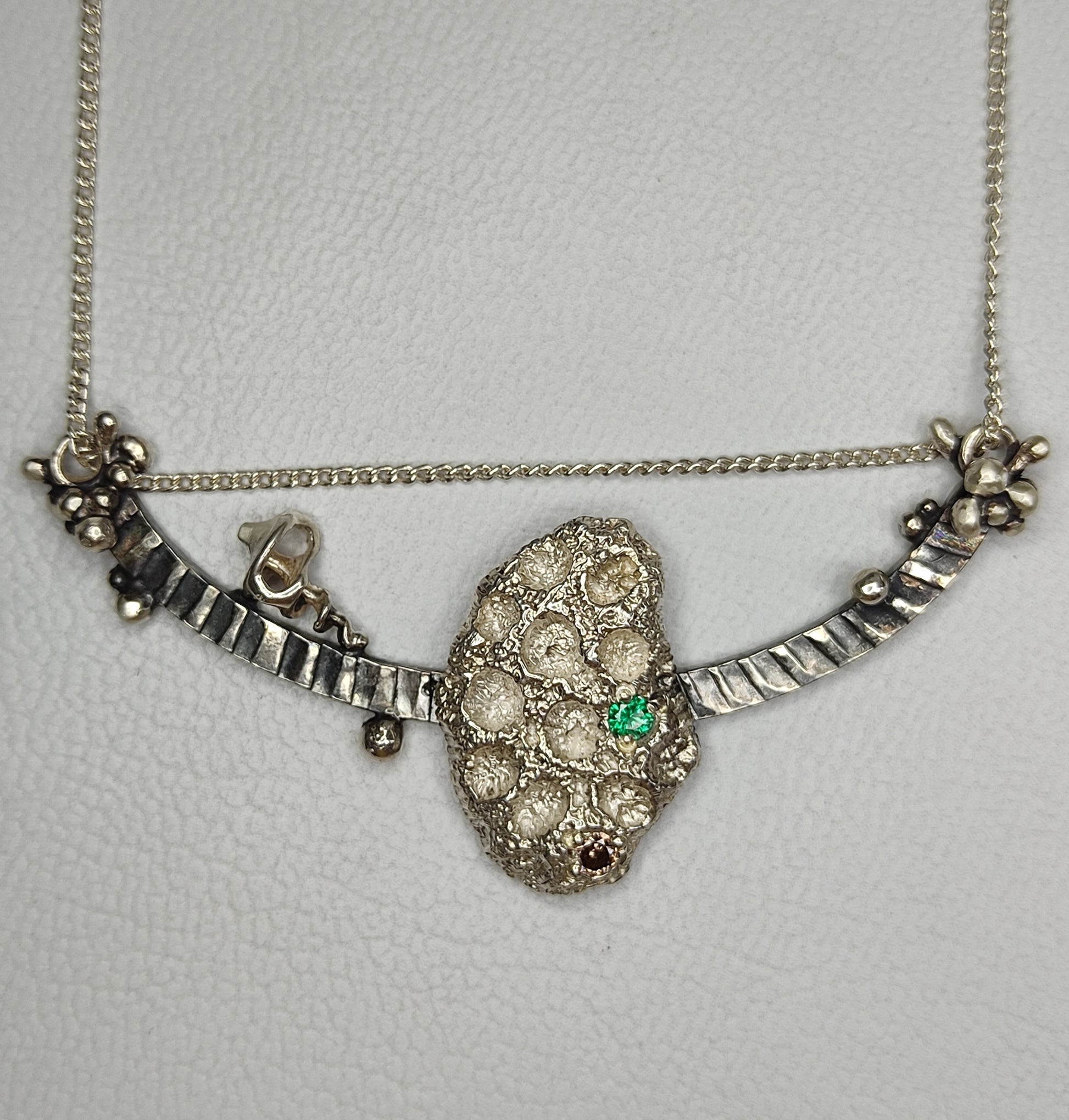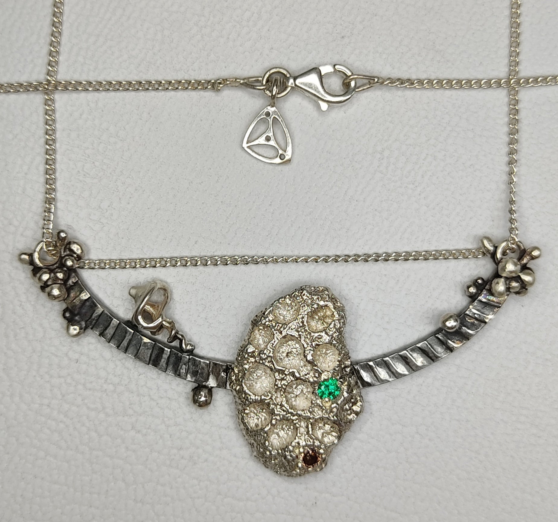 Colgante tipo princesa. Arco plata 950 martillada con caracol, granulado y engaste sobre coral central, zirconios verde y arena, cadena militar, largo 40 cms
